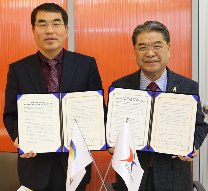 | ▲사진 왼쪽부터 양기대 광명시장, 이재정 경기도교육감이 양 기관간 협약체결후 기념촬영을 하고 있다. © 환경데일리 |