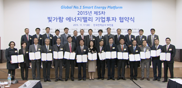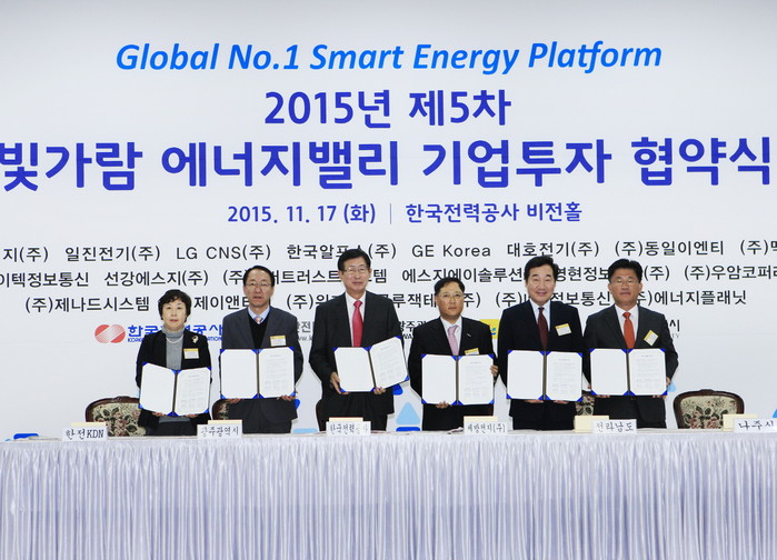 한국전력은 17일 오전 본사 비전홀에서 한전KDN, 지자체(광주광역시, 전라남도)와 함께 세방전지(주) 등 3개 대기업, 외국기업인 GE코리아와 한국알프스(주)를 비롯 대호전기(주) 등 중소기업 12개, Start-up 및 연구소기업 등 총 20개사와 에너지밸리 투자 협약식을 체결했다.
