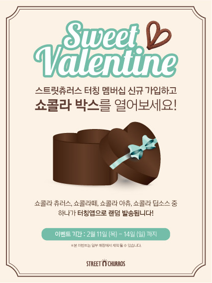 사랑하는 사람에게 초콜릿으로 마음을 전하는 밸런타인데이에 선보이는 이번 이벤트는 모바일 멤버십 서비스 터칭에서 스트릿츄러스 멤버십에 가입하는 모든 사용자에게 증정되며, 스트릿츄러스의 쇼콜라떼와 쇼콜라츄러스, 쇼콜라 아츄, 쇼콜라딥 중 1개 메뉴의 무료쿠폰이 랜덤으로 자동 발송된다.