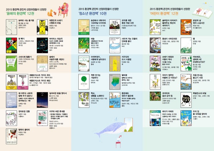 한편 2015 선정위원 추천한 환경책 선정된 일부 목록을 보면 ▲기후변화의 거의 모든 것(필리프 스콰르조니 지음/ 해바라기프로젝트 옮김/ 다른출판사) ▲21세기 시민경제학의 탄생(스테파노 자마니, 루이지노 브루니 외/ 제현주 옮김 북돋움) ▲26층 나무집(앤디 그리피스 글, 테리 덴튼 그림/ 신수진 역/ 시공주니어) ▲3농 혁신(허승욱/ 따비) ▲Stop! 8 : 더워지는 지구 지키기 - 스톱! 주문을 외치면 시작되는 동물들의 과학 토크쇼 | STOP! 8(김산하 글, 김한민 그림/ 비룡소) ▲개똥이네 책방 24]솔부엉이 아저씨가 들려주는 뒷산의 새이야기(이우만/ 보리) ▲걸어다닐 수 있는 도시(제프스펙/박혜인/ 마티) ▲고등학생의 국내 동물원 평가 보고서 최혁준/ 책공장더불어) ▲구름 읽는 책(개빈 프레터피니/김성훈/ 도요새) ▲권오길이 찾은 발칙한 생물들(권오길/ 을유문화사) ▲나는 국가로부터 배당받을 권리가 있다-생태적 전환과 해방을 위한 기본소득(하승수/ 한티재) ▲나는 반핵인권에 목숨을 걸었다(김형률 외/ 행복한책읽기) ▲나는 자연에 투자한다 : 자연과 자본, 그리고 환경 운동의 새로운 연대(마크 터섹,조너선 애덤스 공저/김지선 역/ 사이언스북스) ▲날마다 설레는 텃밭 만들기 다케무라히사오/자연의벗연구소/ 북센스) ▲내 밥상 위의 자산어보(한창훈/ 문학동네) ▲농부가 된 도시사람들(김혜영 외/ 길벗) ▲농장에서 식탁까지 100마일 다이어트(앨리사 스미스 외/구미화/ 나무의마음) ▲독수리는 왜 까치한테 쫓겨다닐까?(김기범/ 자음과모음) ▲동물 홀로코스트 - 동물과 약자를 다루는 '나치' 식 방식에 대하여(찰스 패터슨/정의길/ 동물보호시민단체 KARA/ 休) ▲동물을 깨닫는다 버지니아 모렐/곽성혜/ 추수밭)