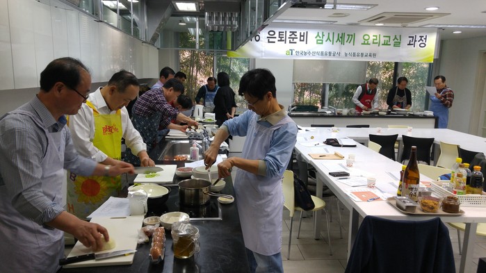 [환경데일리 윤경환 기자] 한국농수산식품유통공사(aT) 농식품유통교육원은 은퇴자와 은퇴 예정자 16명을 대상으로 3월 18일부터 '은퇴준비 삼시세끼 요리교실'을 운영하고 있다.