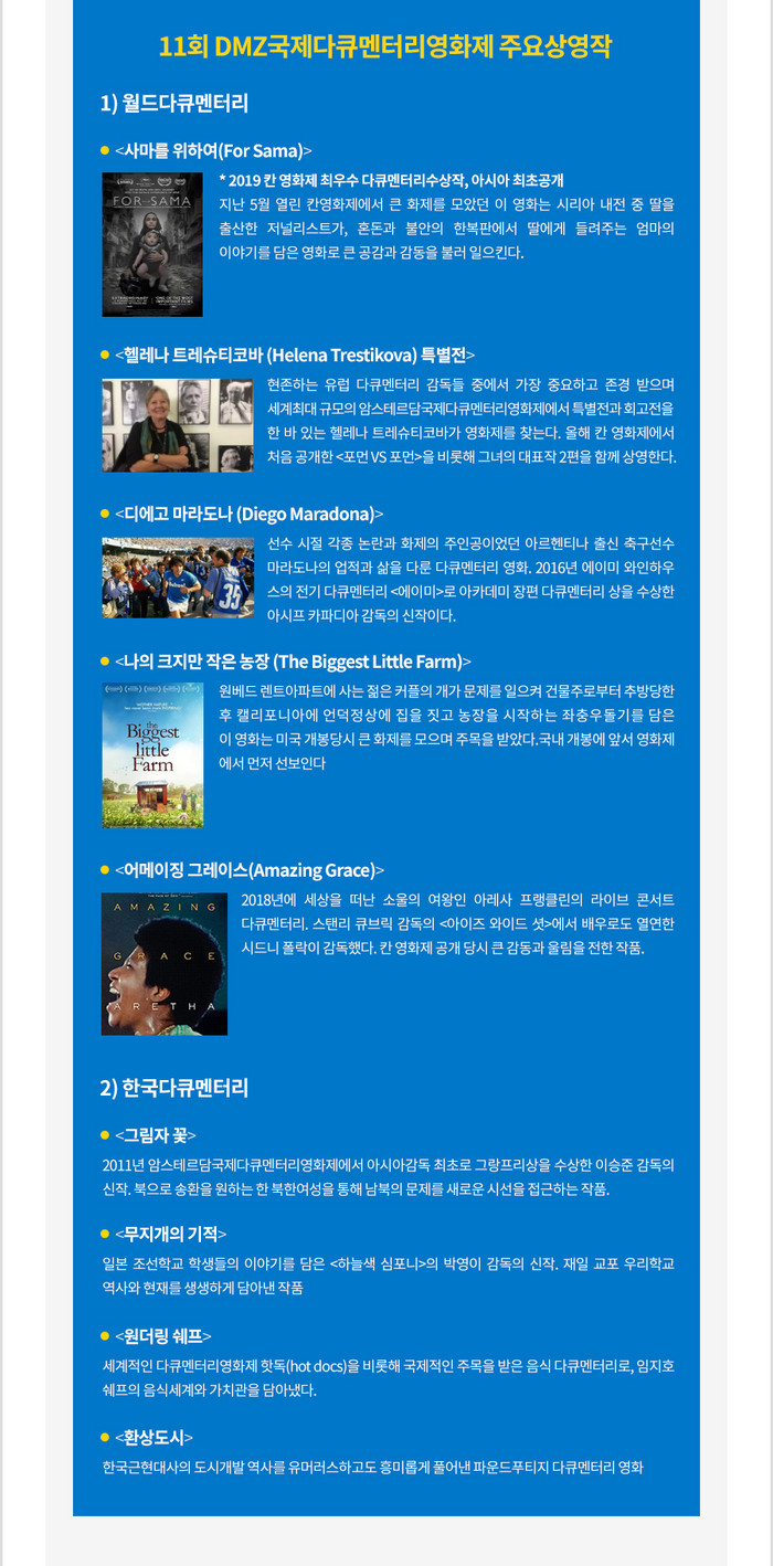 11회 DMZ국제다큐멘터리 영화제는 국제영화제에서 수상한 화제작부터 기대를 모으는 한국다큐멘터리로 그 어느해보다 풍성한 프로그램을 자랑한다. 먼저, 2019년 칸 영화제 최우수다큐멘터리 수상작 '사마를 위하여(For Sama)'가 아시아 최초로 공개된다.