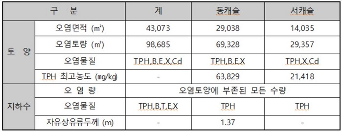 | ▲환경부, 캠프캐슬 환경오염조사 및 위해성평가결과보고서 요약, 동양대학교가 북서울캠 퍼스 부지로 사용하려는 곳은 동캐슬, 서캐슬 두 곳이다. 토양 오염의 경우 TPH(석유계총 탄화수소)는 기준치 500mg/kg보다 무려 127.7배가 넘게 검출됐다. 발암물질인 벤젠의 경우 기준치를 5.7배 초과했다. © 환경데일리 |