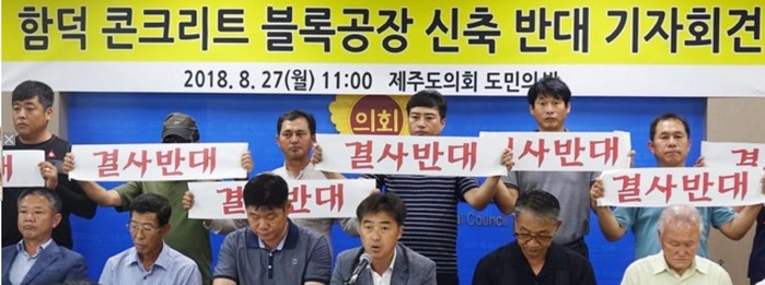 27일 조천읍 함덕, 대흘리 주민들이 제주도의회 도민의 방에서 기자회견을 통해 ㈜대덕 콘크리트 블록공장 건설 계획의 부당성을 알렸다.