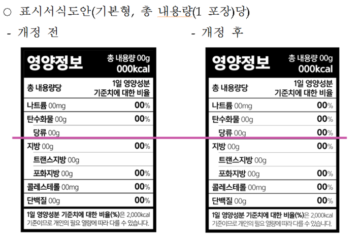 | △ 당류의 1일 영양성분 기준치에 대한 비율표시 의무화에 따른 영양성분 표시도안(개정 전 후 비교) |
