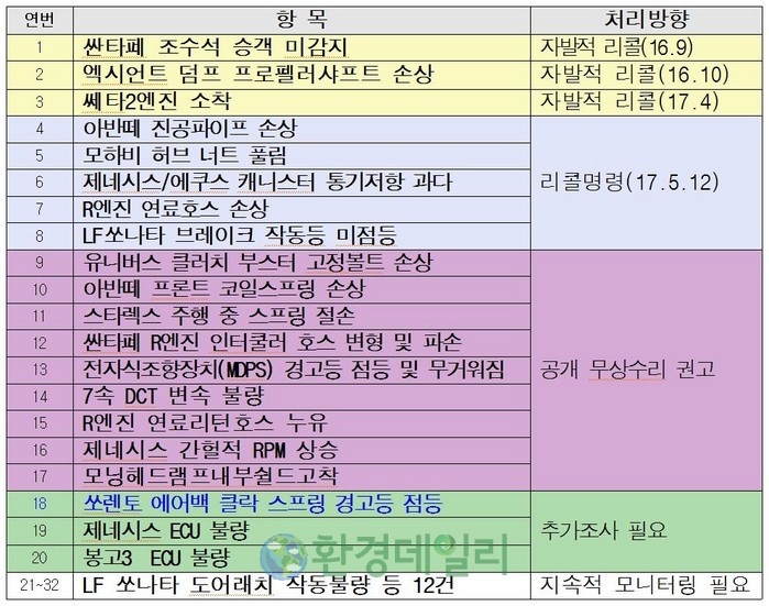 놀라운 사실은 이번 강제리콜에는 내부제보로 알려졌다. 모두 32건의 결함의심 사안 중 현대차에서 자발적으로 리콜계획서를 제출한 3건과 이번에 리콜처분된 5건을 제외한 나머지 24건에 대한 처리방향도 함께 발표했다.