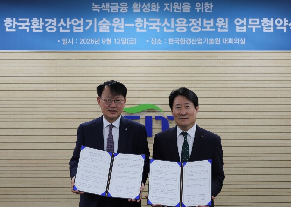 한국환경산업기술원과 한국신용정보원은 12일 KEITI 한국환경산업기술원에서 녹색금융 활성화 지원을 위한 업무협약을 체결했다.