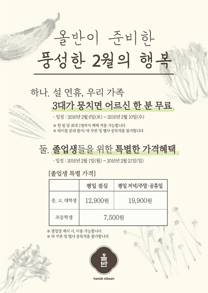 2월 1일부터 21일까지 유치원부터 초중고,대학생까지 평일에 한해 점심 20%, 저녁 30% 할인 혜택을 제공한다. 졸업생 본인 한정으로 졸업장을 지참해야 한다.
