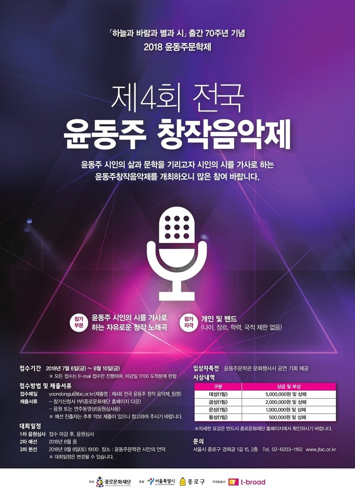 윤동주 창작음악제는 그의 시를 가사로 하는 창작 노래곡을 선보이는 자리이다. 나이, 장르, 학력, 국적 등의 제한 없이 누구나 개인 또는 밴드로 참가할 수 있다. 접수는 8월 19일(마감일 17:00 도착분에 한함)까지이다. 이메일(yoondongju@jfac.or.kr)로 참가신청서와 음원 또는 연주동영상을 제출하면 되고 서류 양식은 종로문화재단 홈페이지에서 다운로드해 사용해야 한다.