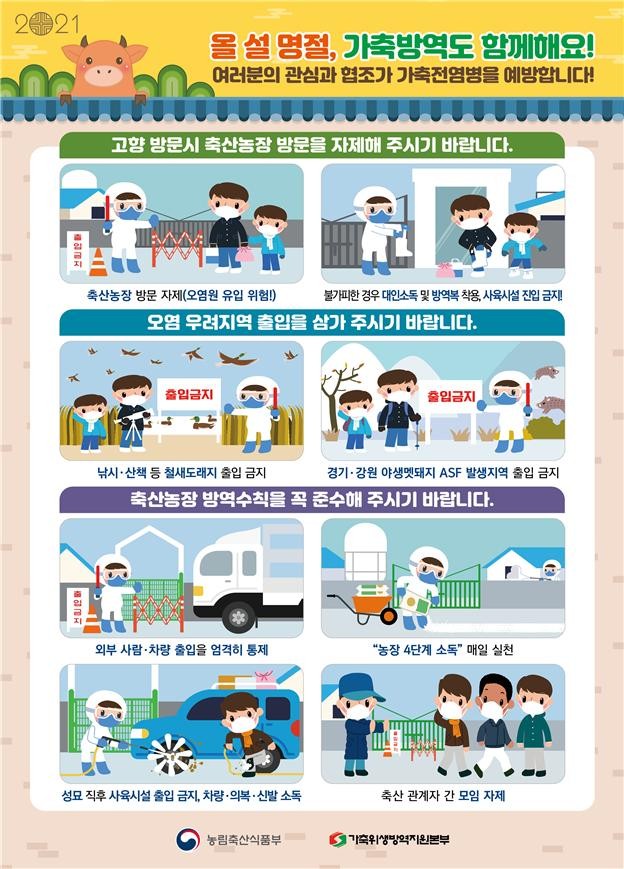 농식품부 및 환경부는 귀성객과 축산농가에 이번 설 명절 기간 동안 준수해야 할 가축전염병 방역수칙을 집중적으로 홍보한다.