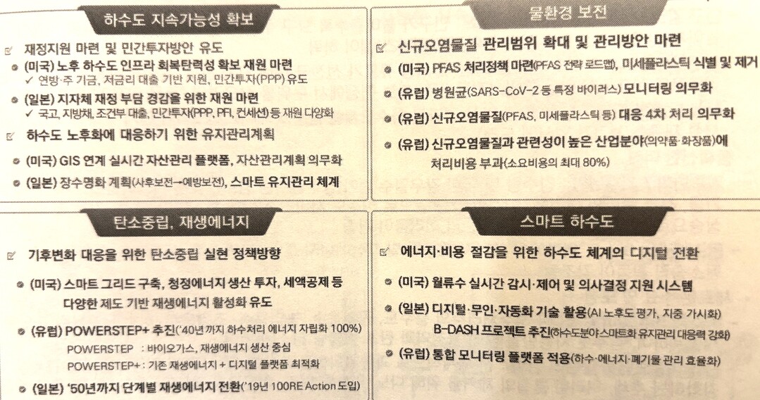 우리 정부는 환경부, 외교부를 중심으로 한국수자원공사, 환경환경공단, 국가물산업클러스터, 한국상하수도협회, 코이카, 한국환경산업기술원까지 국내를 넘어 중앙아시아, 미대륙, 중동 지역까지 하수 재이용, 상수도 기술력 등 다변화된 녹색기술로 업그레이드화돼 수출 지원에 앞장 서고 있다.