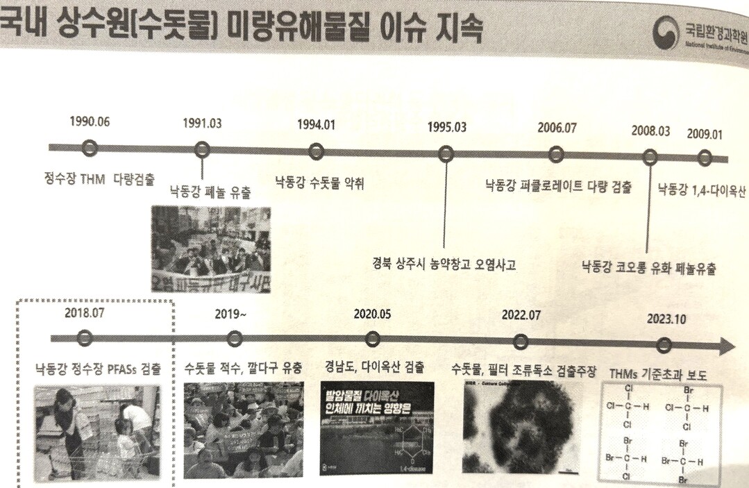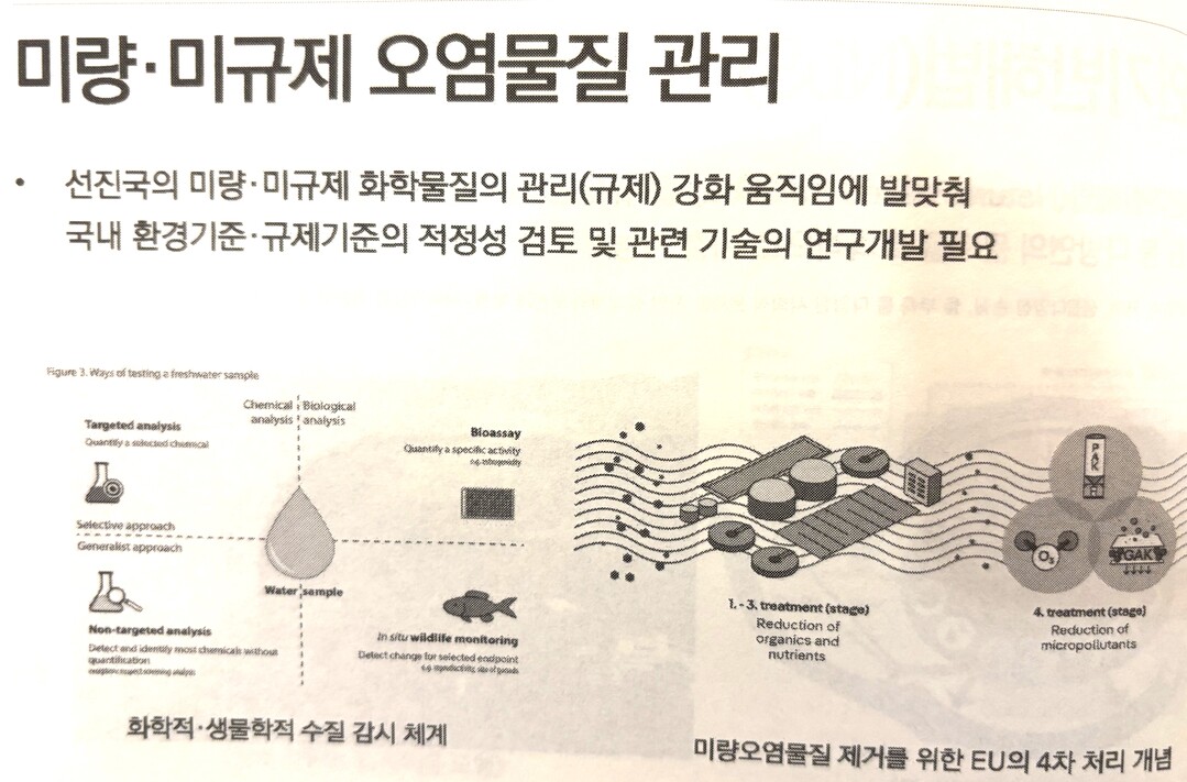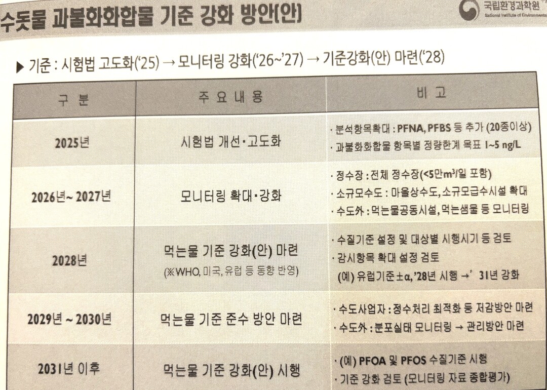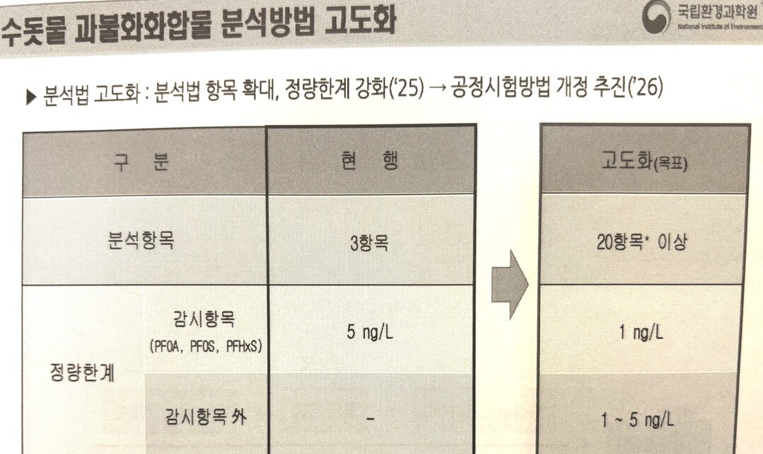 최 연구관은 먹는물 안전성을 높이기 위해 수돗물 과불화화합물 분석방법도 고도화로 끌어올리기 위해 현행 3개 항목에서 고도화 목표를 20항목 이상으로 더 정밀하게 한다고 밝혔다. 정량한계도 기존 5ng/L에서 1ng/L으로 낮춘다. 또 먹는 물 섭취 위해도 평가를 2028년까지 기준 강화안을 마련하겠다고 밝혔다.