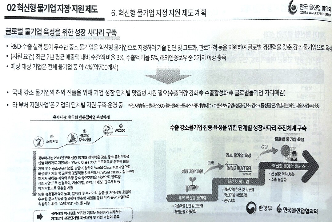 KWP 심유섭 사무국장은 "반년 단위였던 기존 지원을 3년 지속지원으로 확대했고, 연구과제(R&D), 물혁신기술 인증, 해외진출 지원 등 개별 사업도 하나의 체계로 통합했다."며 "혁신형 물기업 제도는 이미 벤치마킹 대상이 될 만큼 선도적 모델로 자리 잡았다."고 설명했다.