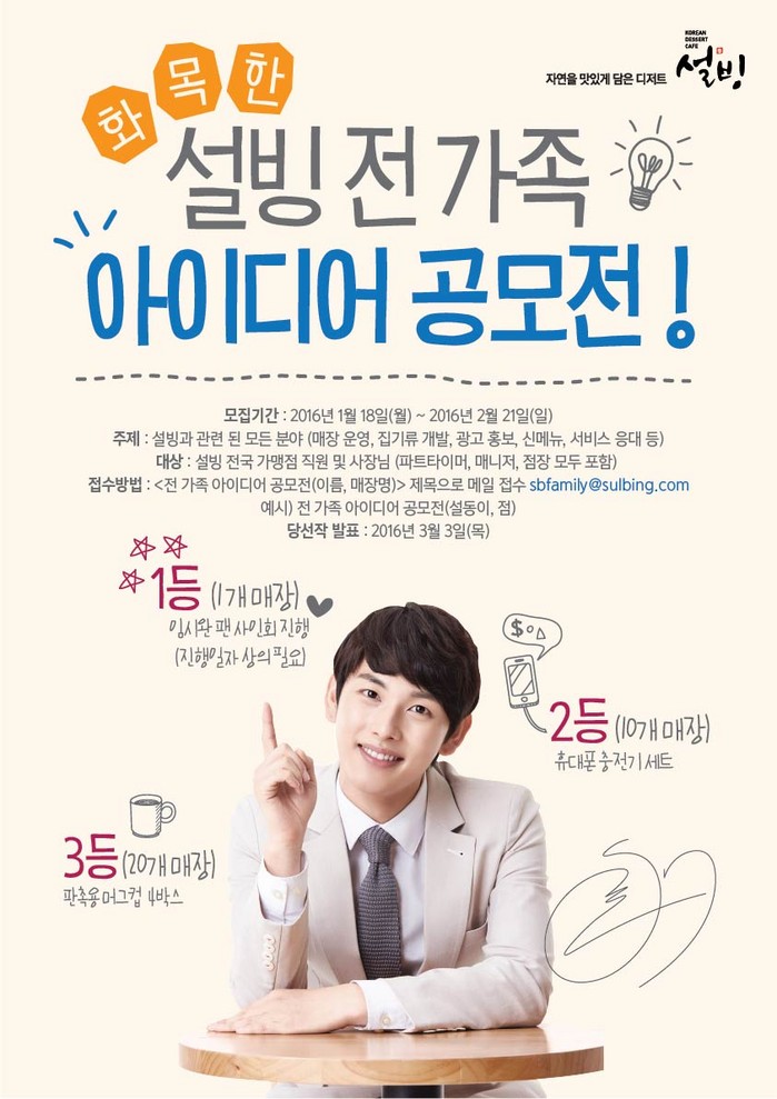사전공지를 통해 1월 18일부터 접수가 시작 2월 21일 마감된다. 3월 3일(목) 최종 당선작을 발표하며 1등(1개매장)으로 선정된 매장에 설빙 공식모델 임시완 팬 사인회 개최의 기회 등 아이디어에 채택된 가맹점에 다양한 혜택이 주어진다.