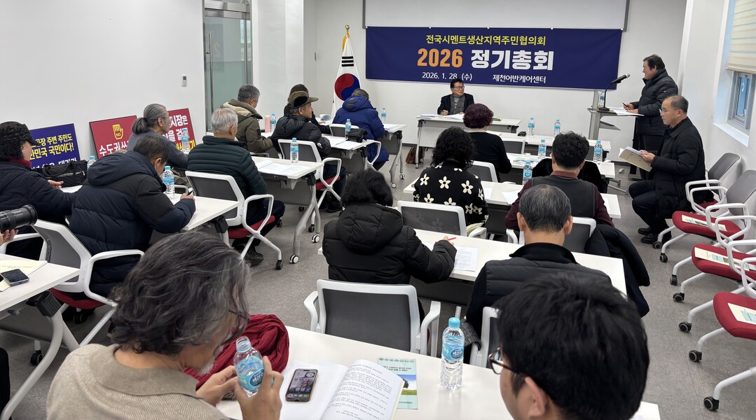 전국시멘트생산지역주민협의회는 28일 제천시 어반센터에서 2026년도 첫 정기총회를 열었다. 이자리에는 강원 충북 6개 주민들로 구성된 회원 활동가 30여 명이 참석했다.