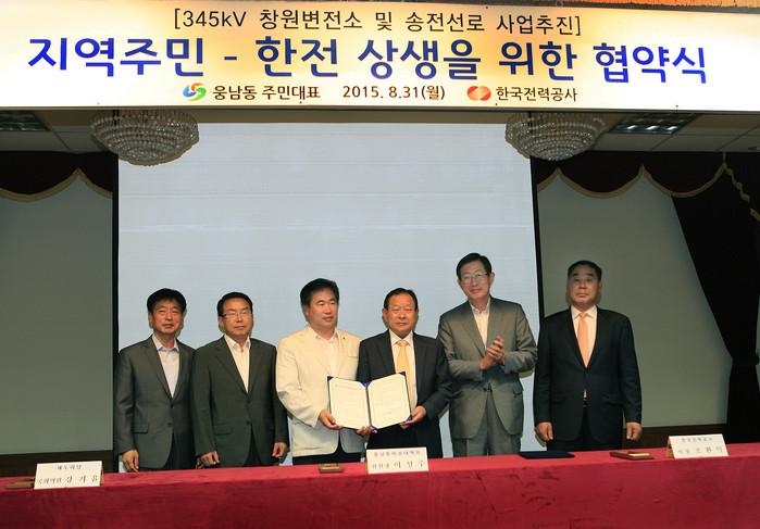 ▲345kV 창원변전소 건설공사를 위한 지역주민과 함께 한전은 상생협력 차원에서 MOU 체결 했다. 이날 체결식에는 (사진 왼쪽부터)장재원 한전 전력계통본부장, 최정경 창원시 성산구청장, 박준 경남도의회 의원, 이성주 비대위원장, 조환익 한전 사장, 권순삼 비대위 부위원장이 참석했다. © 환경데일리 |