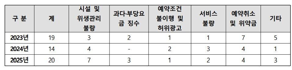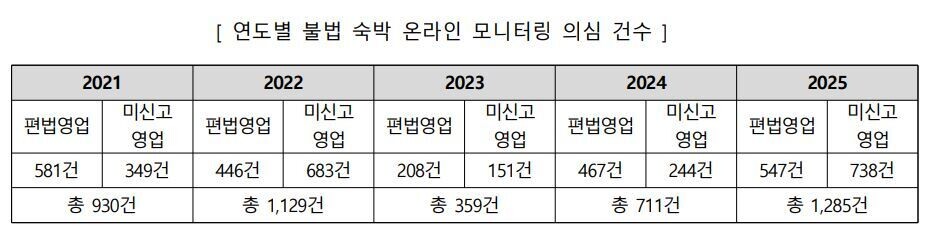 최근 5년간 불법 숙박 온라인 관측 결과, 불법 숙박 의심 건수는 21년 930건에서 25년 1285건으로 증가 추세를 보이고 있다. 관광불편신고센터에 접수된 공유숙박 관련 민원 역시 매년 꾸준히 발생하며 시설 · 위생관리 불량, 과다 요금 징수, 예약 조건 불이행 등 소비자 피해 사례도 이어지고 있다.