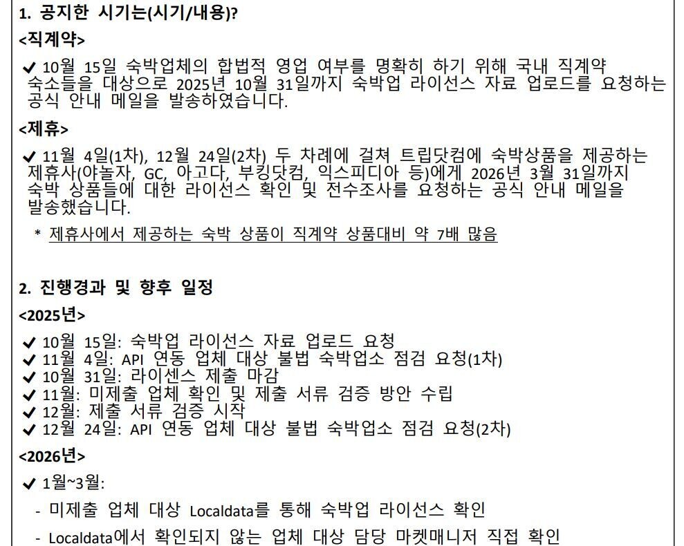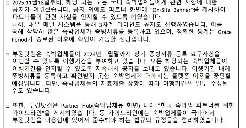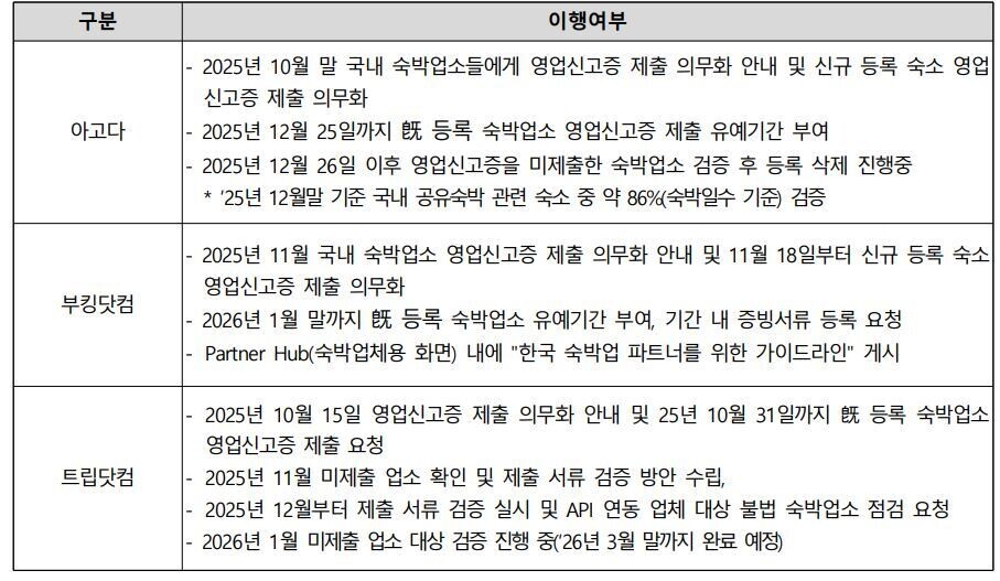 부킹닷컴은 25년 11월부터 신규 숙소 영업신고증 제출을 의무화하고 26년 1월 말까지 기존 숙소에 대한 유예기간을 운영 중이며 트립닷컴 역시 같은해 10월부터 단계적 검증과 API 연동 점검을 진행 중이다.