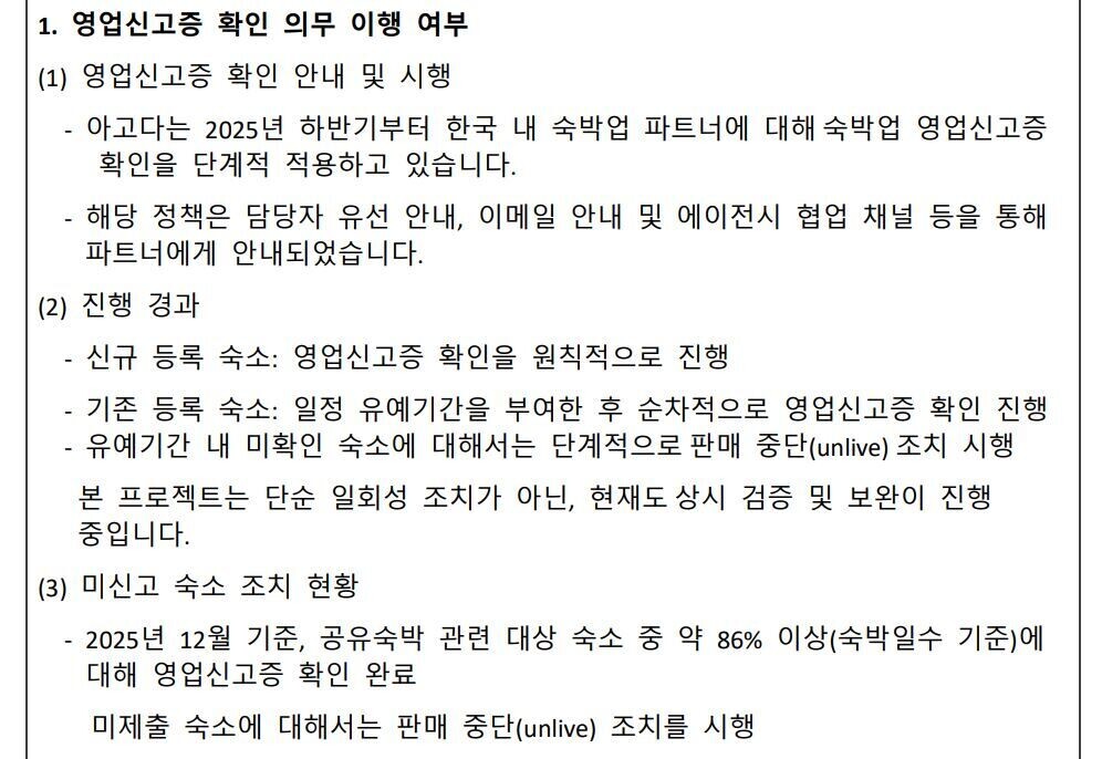 아고다는 2025년 하반기부터 신규 등록 숙소에 대한 영업신고증 제출을 의무화하고, 25년 12월 기준, 공유숙박 관련 숙소 중 약 86% 이상(숙박일수 기준)에 대해 영업신고증 확인 완료, 미제출 숙소에 대해서는 판매 중단 조치를 시행했다고 밝혔다.