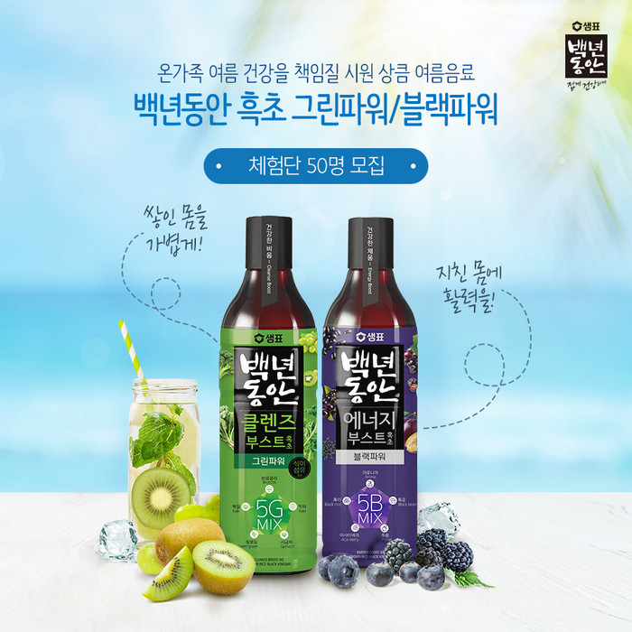 여름철 상쾌하고 가벼운 마실거리를 찾는 사람이나 가족의 건강을 생각하는 사람이면 누구나 이번 체험단 모집에 참여할 수 있다. 선정된 체험단 50명은 백년동안 클렌즈부스트 흑초 그린파워와 백년동안 에너지부스트 흑초 블랙파워를 1병씩 제공받는다.