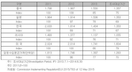 일본 JFE Steel Corporation사는 47.1, 39.0% Nippon Steel & Sumitomo Metal사는 52.2, 35.9, 35.9%, 기타 수출업체 52.2% 확정덤핑마진으로 정해졌다.