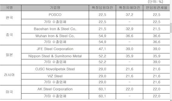 기업별 덤핑마진 및 반덤핑관세율을 보면, POSCO 경우 확정덤핑마진은 22.5% 확정피해마진 37.2%,