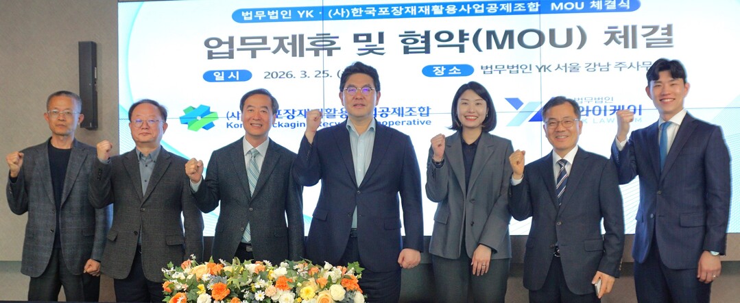 협약식에 포장재공제조합 김동진 이사장, 이성천 사업본부장, YK 강경훈 대표변호사, 홍정기 전문위원, 김지훈 수석변호사, 황현정 기업총괄그룹 변호사 등이 참여했다.