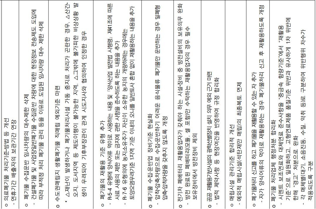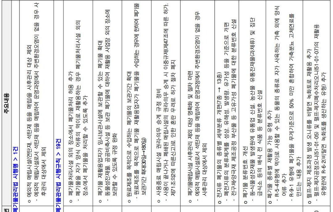 모두 19건의 폐기물 시행규칙을 대표적으로 보면 ▲처리시설 외 장소 처리 허용 추가 ▲원료제조 목적 수입 보관기간 확대 ▲매립시설 사후관리 제외 대상 명확화 및 절차 마련 ▲13종으로 늘린 전지류 종류별 세부분류 ▲종류별 재활용 가능 유형 추가 ▲펄프‧제지 제조과정 발생 오니류 비탈면 녹화토로 재활용 추가 ▲의료폐기물 처리기준·방법 등 개선 ▲수집‧운반업 장비기준 현실화 ▲폐배터리 재활용업자 시설·장비 중 방전설비 보유의무 완화 ▲처리업체 행정처분 합리화 등이 마련됐다.
