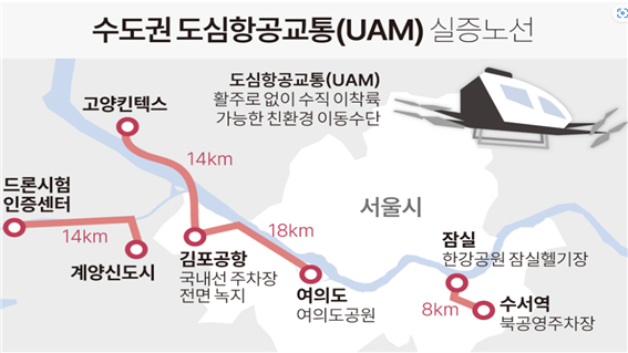 이와 발맞춰 국토부는 UAM 상용화를 위한 기반 구축을 본격화하고 있다. 2024년 '그랜드챌린지 1단계(고흥 비도심)' 실증을 마무리했다. 현재는 '2단계(킨텍스–김포공항–여의도–잠실–수서)' 한강 물길 실증을 진행 중이다.