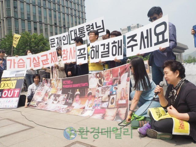 [환경데일리 한영익 기자]가습기살균제 피해자들과 가습기살균제참사전국네트워크(가습기참사넷)가 11일(목) 오후, 광화문광장 이순신장군상 앞에서 긴급 기자회견을 갖고 문재인 대통령에게 후보 때 약속한 공약을 지켜줄 것을 당부했다.