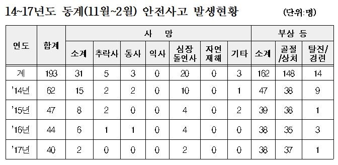 [환경데일리 김영민 기자]강병원 의원실(국회 환경노동위원회·서울 은평을)이 국립공원관리공단으로부터 제출받아 분석한 자료에 따르면 14~17년까지 동계(11월~2월)까지 사망과 부상을 포함한 각종 사건사고가 총 193건인 것으로 나타났다.