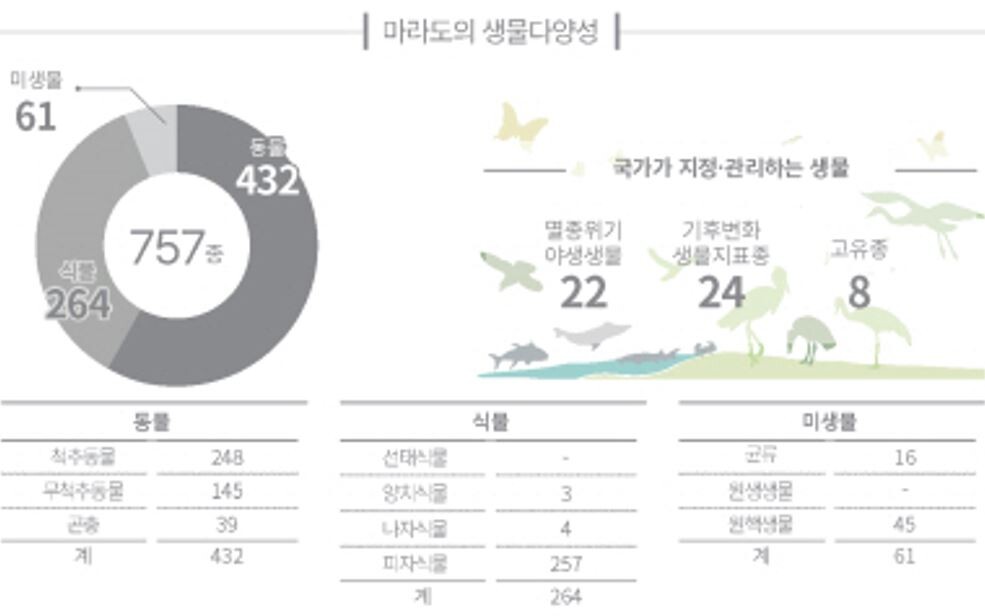멸종위기 야생동물이 많은 섬은 단연 1위는 흑산도, 2위는 소청도, 3위는 밸령도, 4위 대청도, 5위 가거도로 나타났다. 고유종이 많은 섬으로 1위 울릉도, 2위 남해도, 3위 진도, 4위 완도, 5위는 가거도로 조사했다.