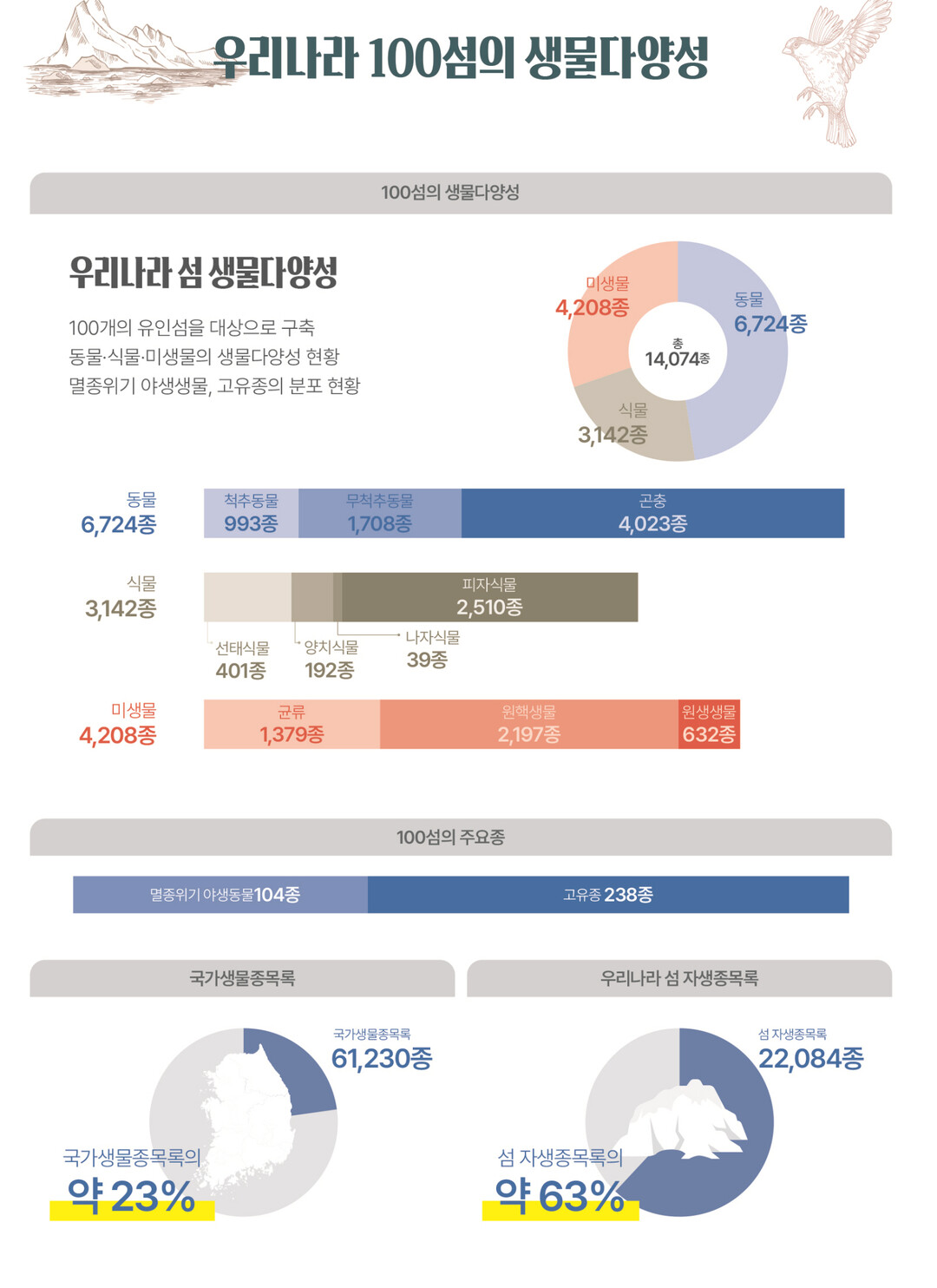5년간 섬 생물다양성 조사를 통해 총 1만 4,074종(동물 6724종, 식물 3142종, 미생물 4208종)을 확인했다. 이는 국가생물종목록 6만 1230종의 약 23%를 차지하며, 우리나라 섬 자생종목록 2만 2084종의 약 63%에 해당한다.