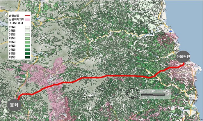 사업예정지 중 울진~봉화를 지나는 동부1, 2구간은 올해 발생한 울진산불 피해지를 관통한다. 전체 44km 구간 중 15.98km 구간이 소나무림과 산불 취약지에 인접해 산불 피해 위험이 높은 것으로 나타났다. 다만 한전의 전력영향평가에 따르면 송전선로 입지 선정 기준에 산불 위험성은 고려되지 않는다.