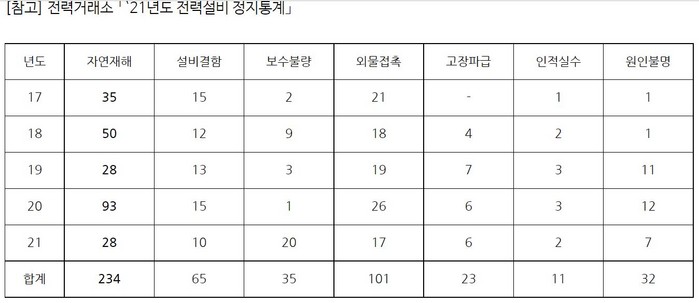 이 자료에 따르면 30개 송전선로에서 59건의 고장이 발생했고 500여 시간 동안 선로정지가 발생한 것으로 나타났다.