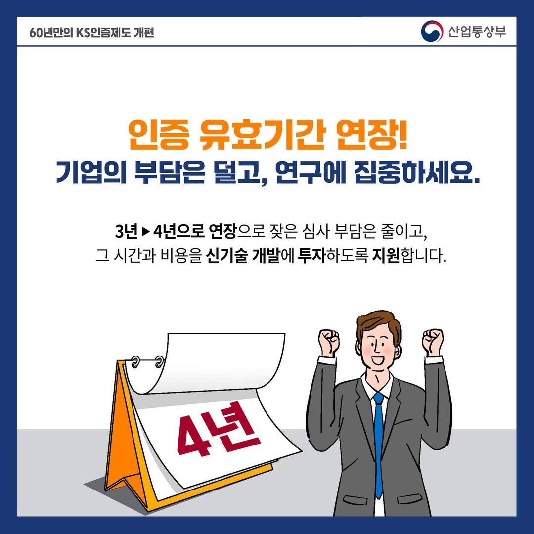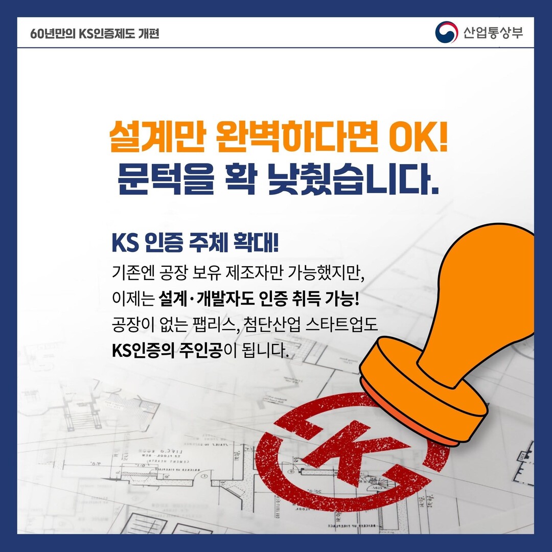 변화된 개편 내용은 보면, 제조설비가 없는 설계·개발 기업도 KS인증을 받을 수 있게 된다. 또한, 산업 특성을 반영한 맞춤형 인증을 도입해 기업이 기술 경쟁력 강화에 집중할 수 있는 여건을 마련하겠다.