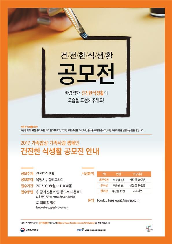 공모전의 시제인 '건강한 식생활'이란 농림축산식품부에서 권장하고 있는 '바른밥상, 밝은 100세' 5대 실천지침(텃밭 가꾸기, 채소‧과일먹기, 음식물쓰레기 줄이기, 아침밥먹기‧ 가족밥상의날 실천하기, 축산물 저지방부위 소비하기)을 실생활과 밀접하게 실천하는 것을 의미한다.