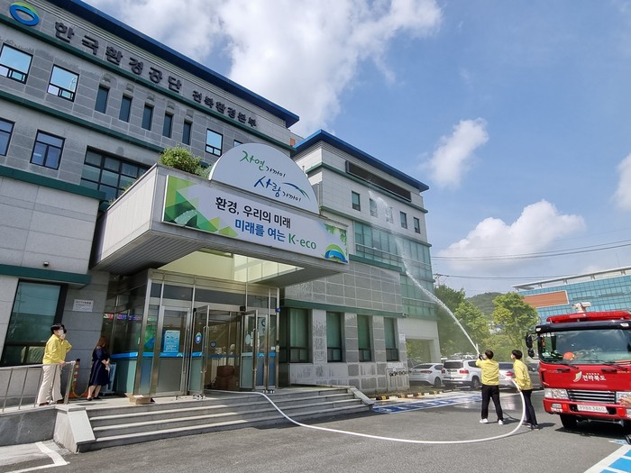 ▲한국환경공단 전북본부에서 전체 임직원들이 유사시를 대비한 화재진압 등 훈련을 참여했다. |