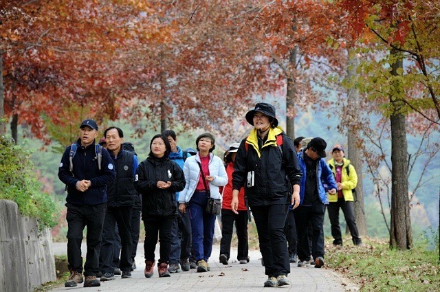 ▲숲해설가들이 산림투어하는 일반인들을 대상으로 숲속이야기, 나무이야기, 산림의 중요성을 재미있게 들려주고 있다. <사진제공 산림청> © 환경데일리 |