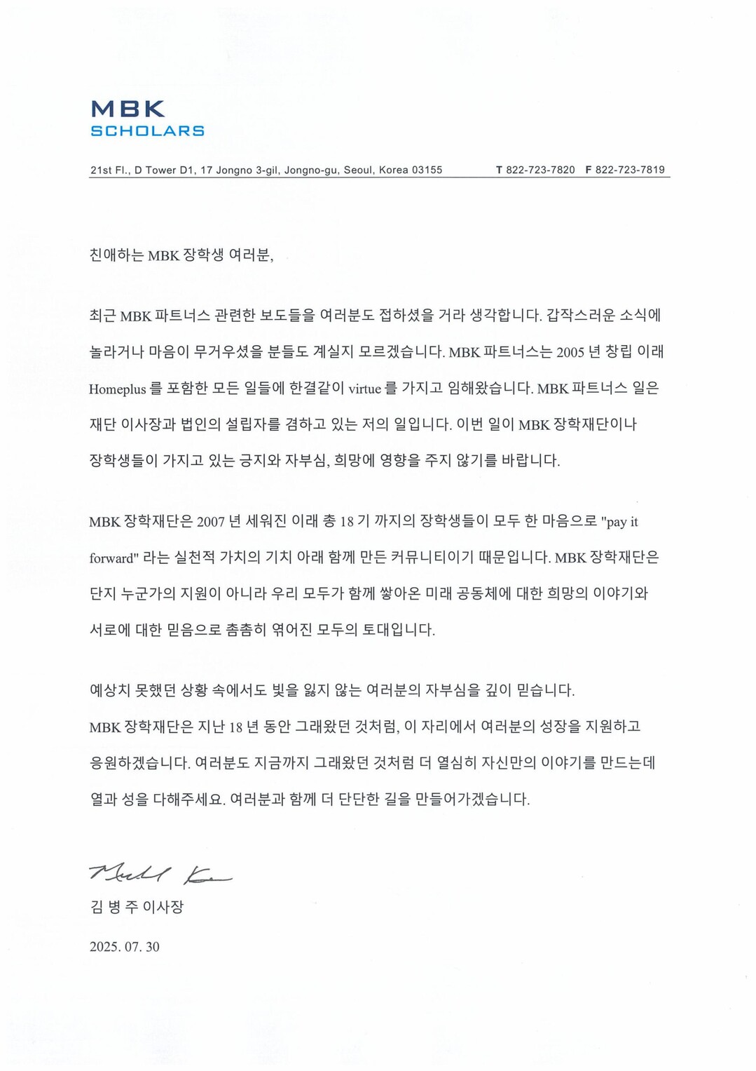 김 회장, 장학재단 홈피 자신 입장 밝혀