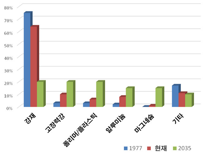 차량 제조에서 부품 소재의 구성 비중 변화를 보면, 1977년 무거운 강재 73% 비율에서 2035년에는 18%로 낮출 것으로 전망했다. 고장력강, 폴리머 플라스틱은 매년 증가해 2035년까지 20%까지 내다보고 있다.
