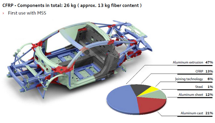 지난 10월 전북 전주에서 개최된 국제 탄소페스티벌에 참가해 국내 기업과의 협력을 모색한 바 있는 독일AUDI 경량화 디자인센터 Bernd Mlekusch 소장은 "AUDI는 이미 다종소재 혼용기술을 통해 더욱 빠르고 가벼운 경량화 콘셉트카인 R8 2세대 V10 Plus 모델을 개발 중"이라며, "차세대 R8 시리즈는 차체의 80%를 알루미늄 소재, 13%를 탄소복합재로 구성하는 것이 목표"라고 밝힌 바 있다.