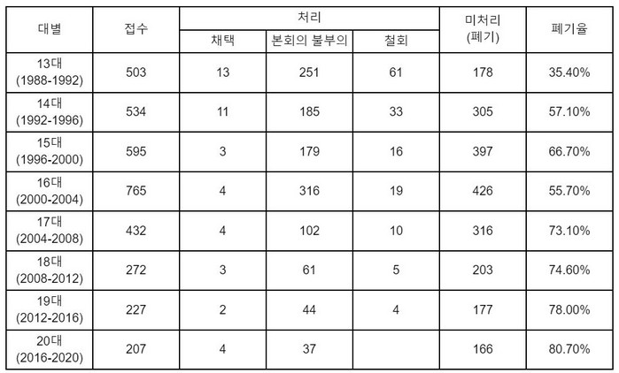민주화 이후인 제13대 국회부터 임기만료로 폐기되는 청원 비율은 지속적으로 높아지고 있고, 특히 국민동의청원 제도가 신설된 20대 국회의 청원 임기만료폐기율은 80%를 넘어 역대 최고치를 기록했다.