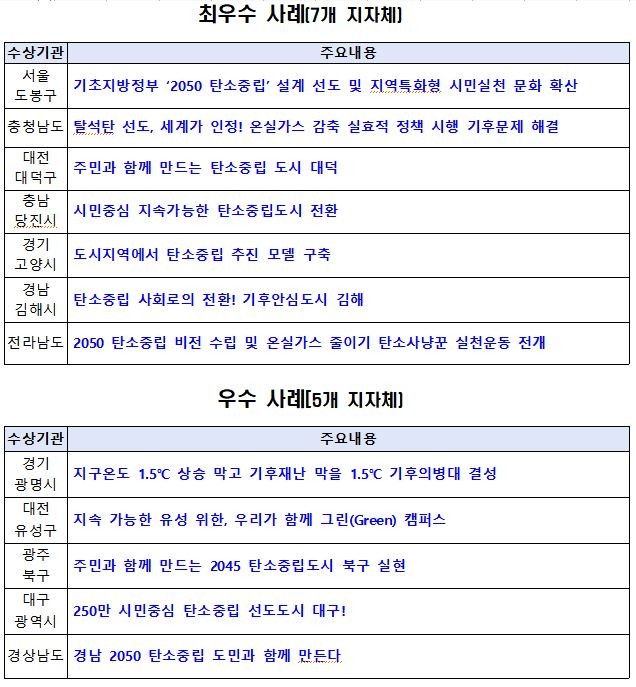 탄소중립 추진 우수 사례에 선정된 지자체 5곳은 경기 광명시, 대전시 유성구, 광주시 북구, 대구시, 경남도이다. 이들 지역은 산업계, 학계, 청년, 시도민 등 다양한 계층이 참여하는 거버넌스 강화와 생활실천형 홍보활동을 중점적으로 추진했다.
