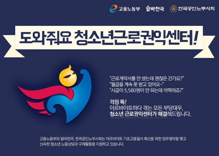 이번 캠페인은 근로 경험이 부족한 청소년과 대학생들의 권익을 지켜주기 위해 보다 체계적이고 적극적인 보호장치를 마련하기 위한 것으로 아르바이트 중 근로계약서 미작성, 최저임금 미달 등으로 인한 고충이 있거나 부당대우를 받았을 때 쉽고 빠르게 상담하고 해결 지을 수 있도록 하는 캠페인이다.