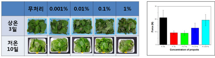프로폴리스는 꿀벌이 침이나 분비물에 나무, 꽃, 풀 등에서 나오는 진액을 섞어 만든 물질로 항균, 항염, 면역 증강, 항산화 작용 등을 하는 것으로 알려져 있다. 프로폴리스는 건강기능식품으로 항산화 효과에 대한 효능이 등록돼 있으며, 이로 인해 엽채류의 신선도가 유지되는 것으로 판단된다.