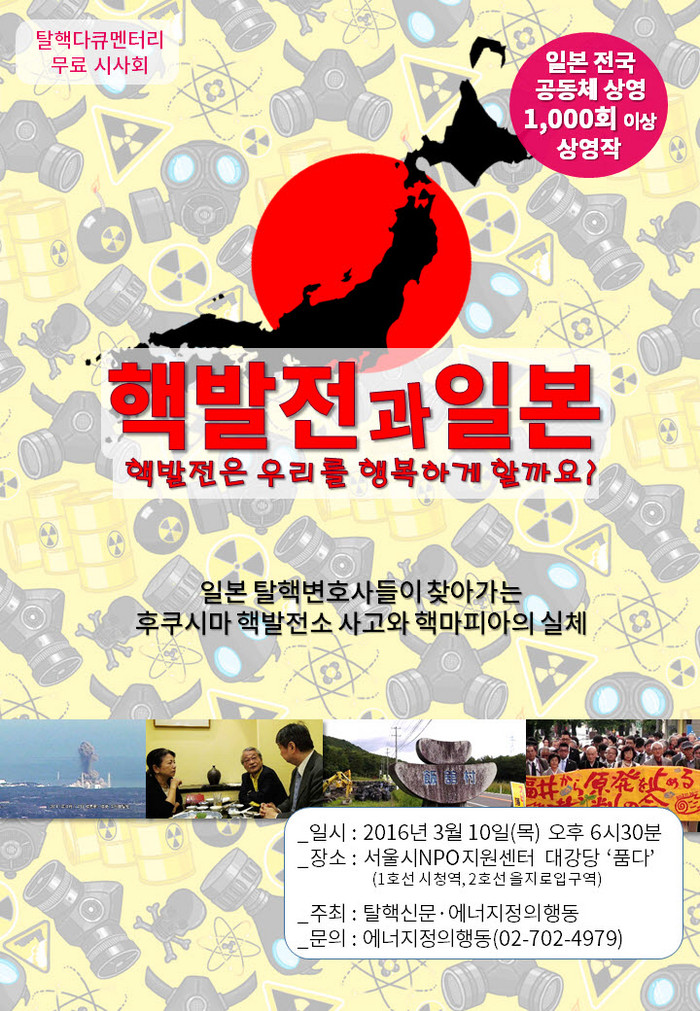 후쿠시마 핵발전소 사고 5주기를 맞아 3월 10일(목) 오후 6시30분 서울시NPO지원센터 대강당 품다(1호선 시청역, 2호선 을지로입구역)에서 열린다.