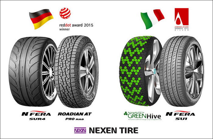 넥센타이어는 레이싱용 타이어인 '엔페라(N’FERA) SUR4'와 SUV/LTR 전용 타이어 '로디안(ROADIAN) AT PRO RA8'제품이 독일 '레드닷 디자인 어워드'에서 본상을 수상한데 이어 이탈리아 디자인상인 'A 디자인 어워드'에서는 친환경 컨셉타이어 'Green Hive'와 고급 세단용 타이어 '엔페라(N’fera) SU1'제품이 은상을 수상했다.
