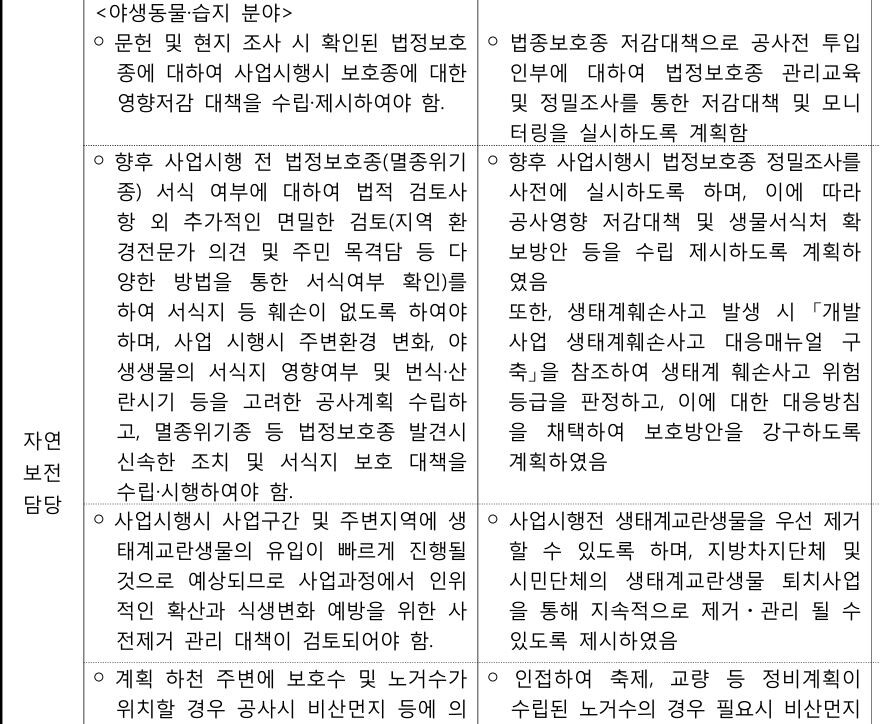 생태전문가나 공사 설계 관계자들은 "공사 주변은 공사로 인해 반환경적인 영향을 미치고 사람을 다치게 할 수 있는데도 공사 금액때문에 거의 지키지 않는다."고 목소리를 냈다.