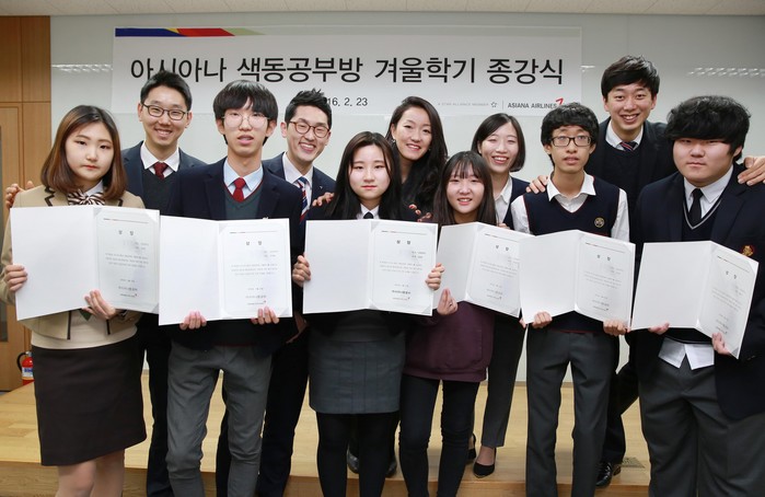 아시아나항공(사장 김수천)은 23일 서울시 강서구 오쇠동 아시아나타운에서 강서구내 고교입학을 앞 둔 중학생들을 대상으로 5개월간 운영해 온 색동공부방 겨울학기 졸업식을 열었다. 이날 학생 전원에게 상장을 표창함으로써 자신감을 북돋아 주는 또 다른 계기를 마련했다.